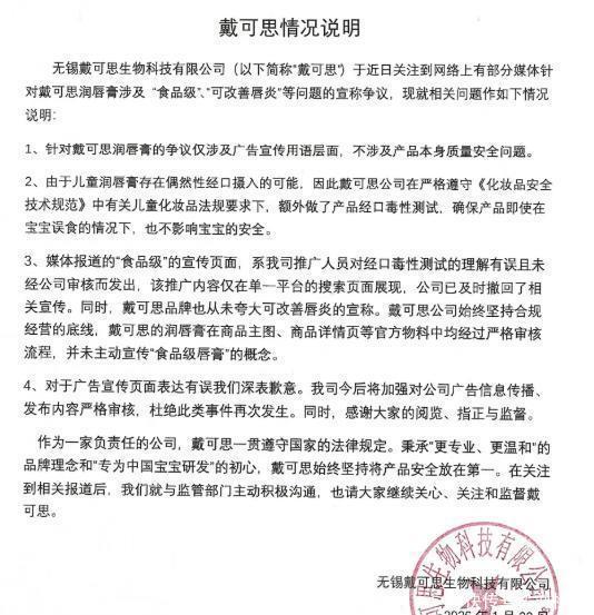 戴可思致歉:已及时撤回相关宣传争议不涉及产品质量安全问题1月22日,戴可思在多个社交平台官方公众号均就此事发布声明。声明显示,媒体报道的“食品级”的宣传页面,系公司推广人员对“经口毒性测试”的理解有误且未经公司审核而发出,该推广内容仅在单一平台的搜索页面展现,公司已及时撤回了相关宣传。戴可思表示,针对戴可思润唇膏的争议仅涉及广告宣传用语层面,不涉及产品本身质量安全问题。