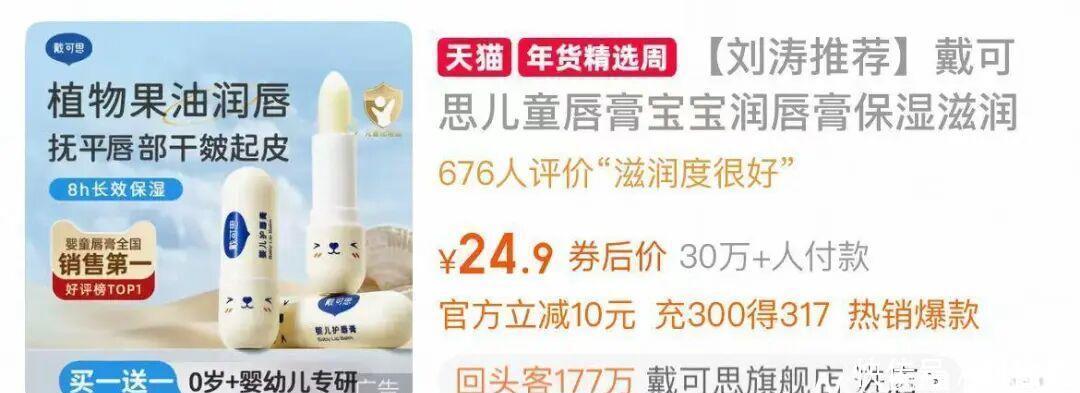 近日,郭晶晶、刘涛代言的婴童护理品牌“戴可思”被曝一款儿童唇膏宣称为“食品级润唇膏”,涉嫌违反《儿童化妆品监督管理规定》。针对此事,1月22日,戴可思官方发布致歉声明称,“食品级”的宣传用语为公司推广人员对“经口毒性测试”的理解有误且未经公司审核,公司已及时撤回了相关宣传。1月22日,戴可思创始人张晓军向记者表示,此次争议不涉及产品质量问题。1月22日,无锡市新吴区市场监管局宣传科向记者表示,该局已于近日对戴可思进行立案调查。一款儿童唇膏宣称“食品级”戴可思被当地市场监管局立案调查有媒体近日报道,戴可思于电商平台旗舰店销售的一款儿童唇膏在宣传页面中称“食品级润唇膏”,涉嫌违规。2021年,国家药监局发布《儿童化妆品监督管理规定》,这是我国首部针对儿童化妆品发布的监管规定,该规定已于2022年1月1日起施行。根据《儿童化妆品监督管理规定》,儿童化妆品标签不得标注“食品级”“可食用”等词语或者食品有关图案。